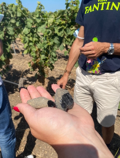 一部の畑は死火山のモンテ アルチ(Monte Arci)に由来する黒曜石が多く含まれています。黒曜石はこのエリアで良く見られる火山石で宝石にも使われています。かつてモンテ アルチが噴火した際、流れた溶岩が変化して黒曜石が出来ました。アッツェイの畑は黒曜石が多く含まれ、火打石も見受けられます。火山に由来する土壌には、リン、カリウム、マグネシウムが豊富に含まれており、複雑なワインを造るのに適した栄養をブドウの木に与えます。