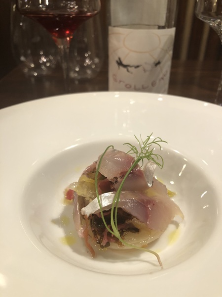 次も同じ産地(造り手)のワインで、グロローというロワールのローカル品種を使ったライトボディの赤と「関アジと発酵キャベツのサラダ仕立て」と合わせました。発酵レモン酢でマリネした関アジの味わいと、炭酸浸漬状態を保った醸造法により生まれるワインの酸がぴったりマッチ。更に発酵キャベツの甘酸っぱさと、フレッシュなワインのタンニンが相乗効果をもたらします。香草ディルの風味が良い仕事をしてくれました。