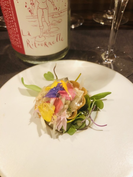 ほんのり微発泡するブルグイユ・ロゼに合わせたのは「アサリと根セロリのタルトレット」で、トマトのジュレが乗せてあります。貝やトマトの旨みがカベルネ・フランの甘酸っぱい果実味にぴったりと寄り添いました。このワインが生まれるロワール辺りは100万年前は海の底だったお蔭で、わずかに塩とミネラルがワインの中に感じられます。おかげでアサリとも相性が良いのでしょう。