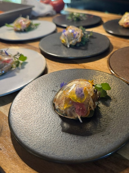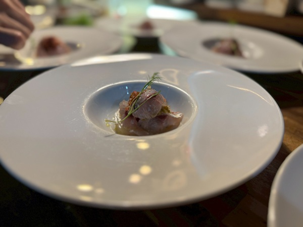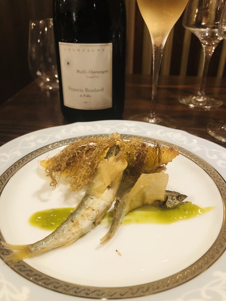稚鮎のカリッとした食感、ほどよい苦みと清々した香ばしさと見事にリンク。揚げたヤングコーンがまた芳ばしくて、同時に味わう事で更にシャンパンの味わいが際立ちました。そして梅のソースと、ピノ・ノワール由来の赤い果実の酸味も相性を高めてくれます。
