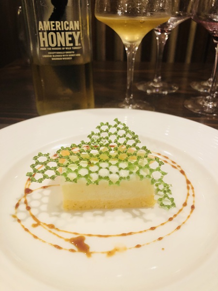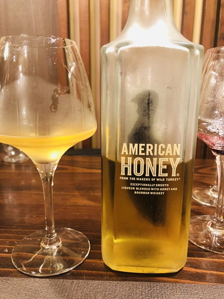 これはバーボンと蜂蜜が絶妙に溶け合ったリキュール。バーボン樽由来のウッディな香りとキャラメルのアロマが楽しい甘口のリキュール。甘すぎるとご指摘のお客様には辛口のスパークリングを加えて甘味を押さえましたが、それでも甘い(笑)。賛否両論のリキュールでした。