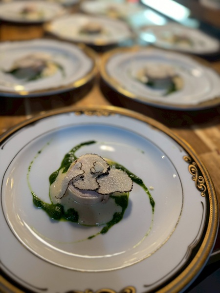 カベルネフランなのでベリー系のアロマと優しいスパイスを思い浮かべながら、でもしっかりとした重厚感はあるのかなと思いシェフに伝えると、山椒を使ったソースに仕上がりました。直前でワインを試飲しマスタードを加えてました。